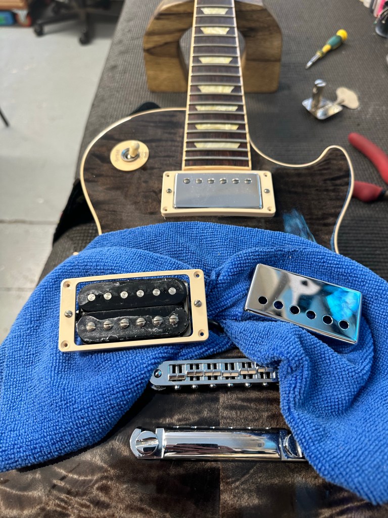 This amazing LP Standard needed a fret levelling and was setup with 10-52 in E standard. I also removed the chrome pickup covers and cleaned up the wax to reveal black bobbins.