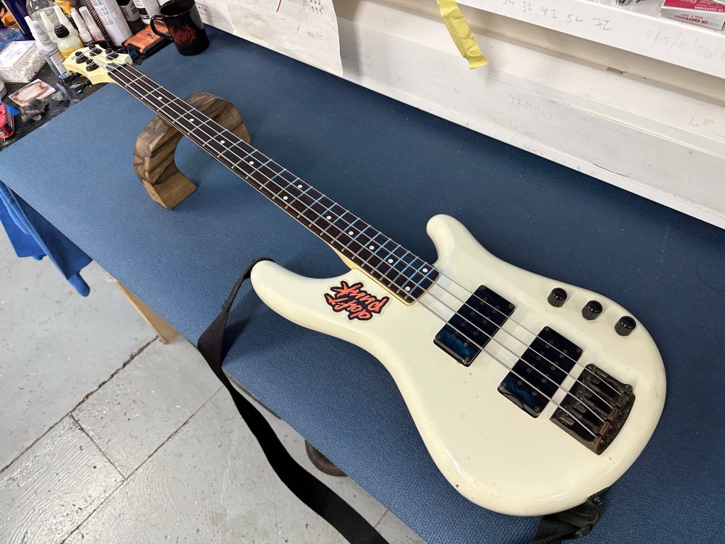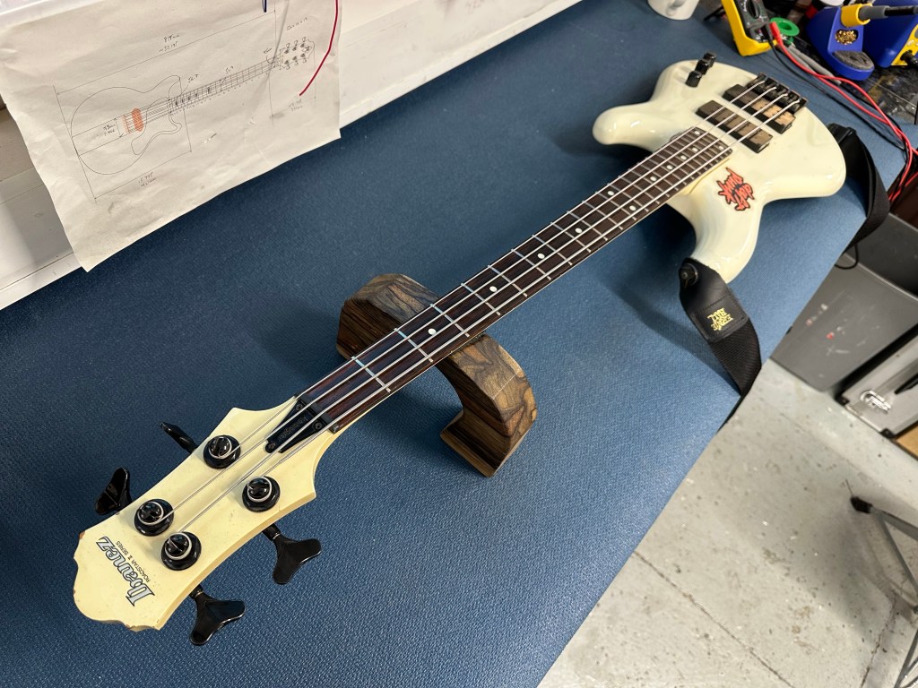 An Ibanez Roadstar II from the late 80’s and it’s the bass you play in your stormtrooper armour. Unfortunately she has a slightly warped neck, so it was slim odds to get this in shape. Two fret levelling attempts later and a many setup adjustments, and she co-operates in E standard tuning but not in the lower D standard asked for by the customer unfortunately. There is some buzz coming from the higher frets in lower tuning. The solution for this is a replacement neck or a refret.