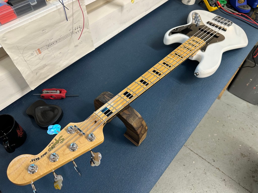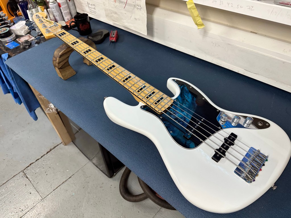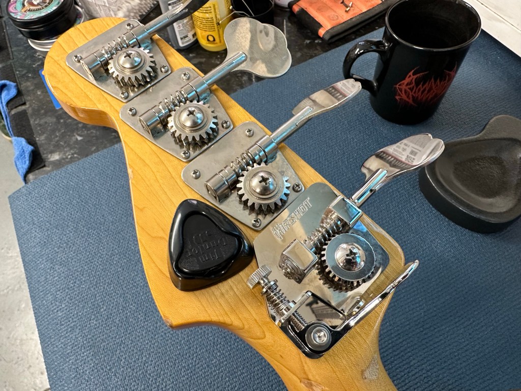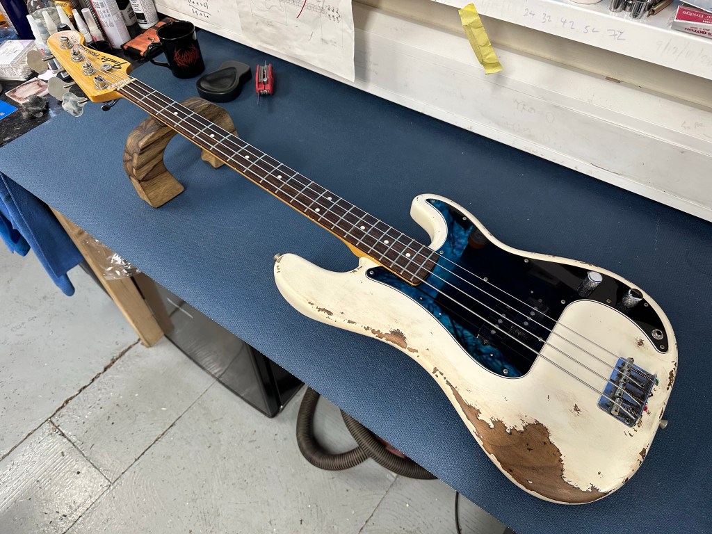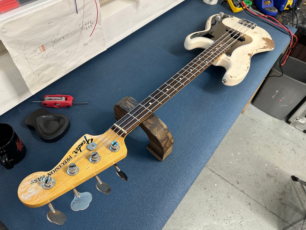 Fender P-bass had a Hipshot BT2 installed for that quick drop tune. Also fret levelled, then setup with 45-100 D’Addario XL in E standard. It’s a really nice playing bass.