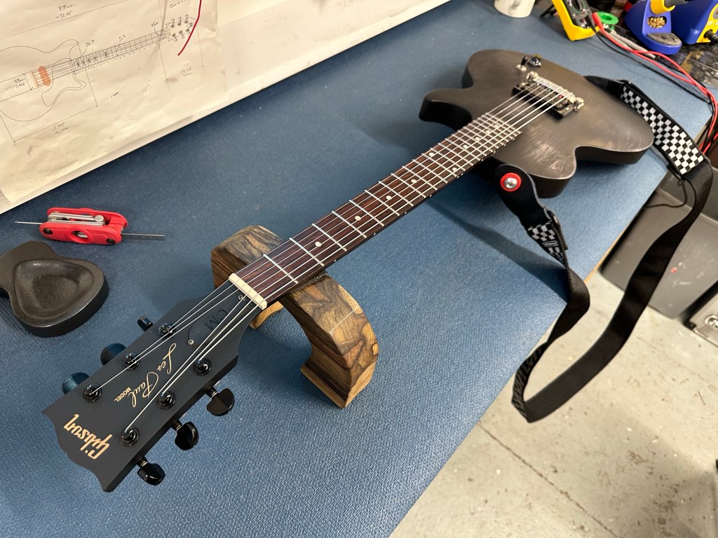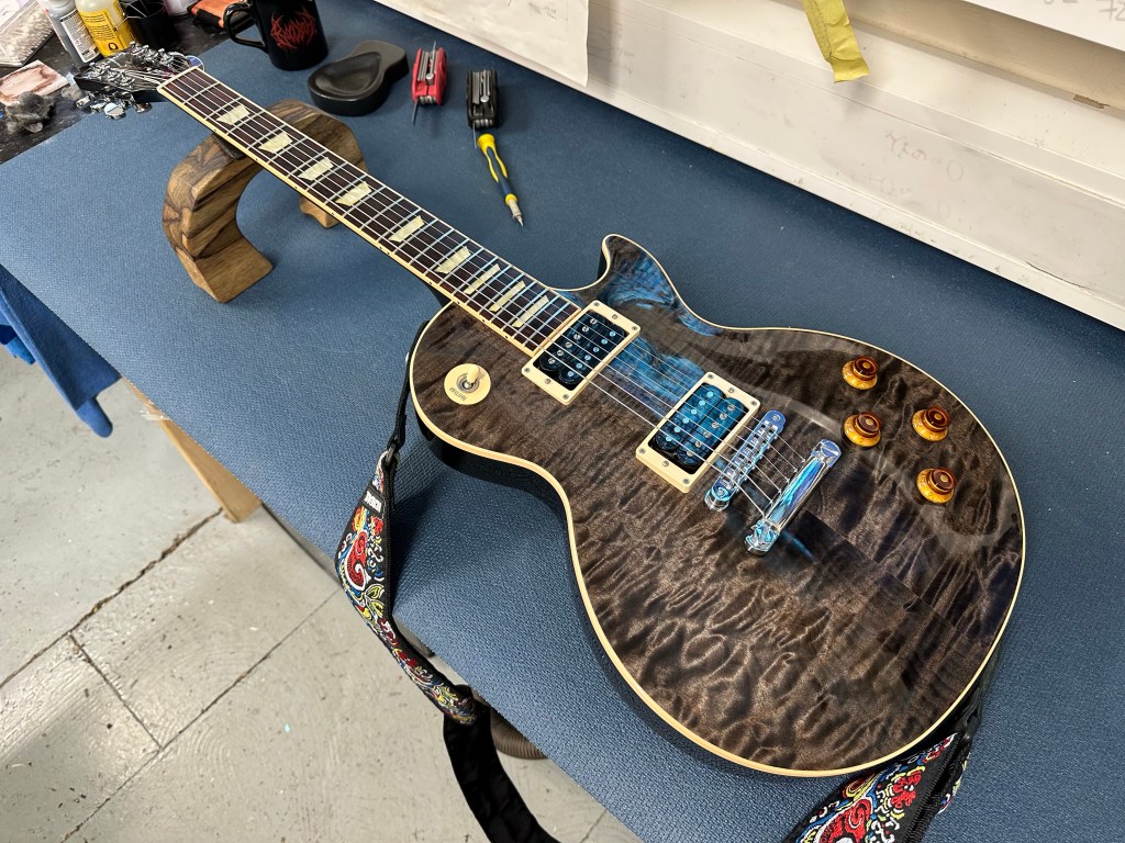The Gibson CM had the most work: fret levelling, swapping out the old robot tuners for a set of Gotoh SG381, removal of one pot and installation of a DPDT on-on-on switch for series/parallel/coil split selection on a freshly installed Bare Knuckle Warpig pickup. Also a wax coat and our usual setup procedure.