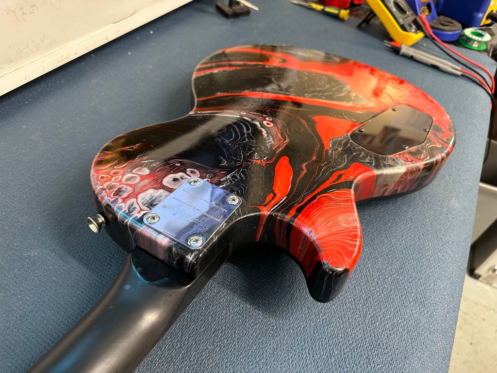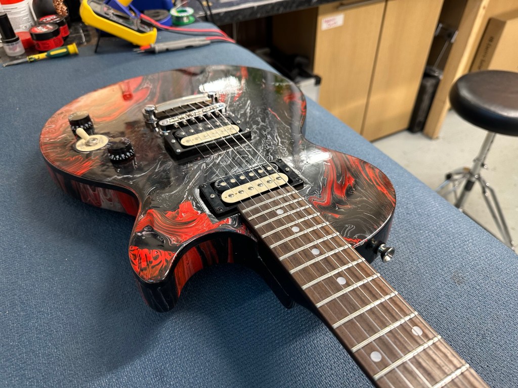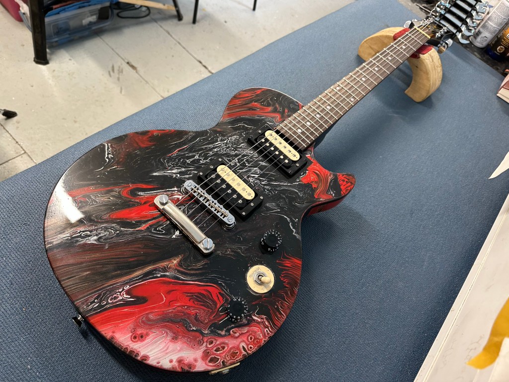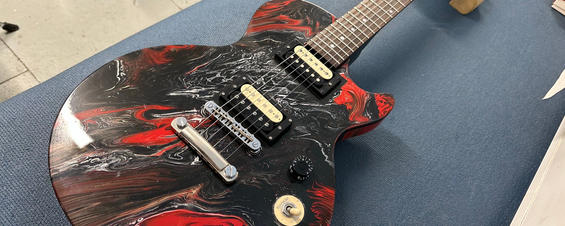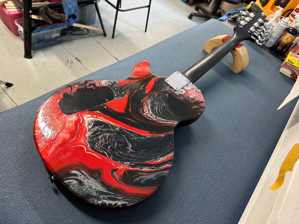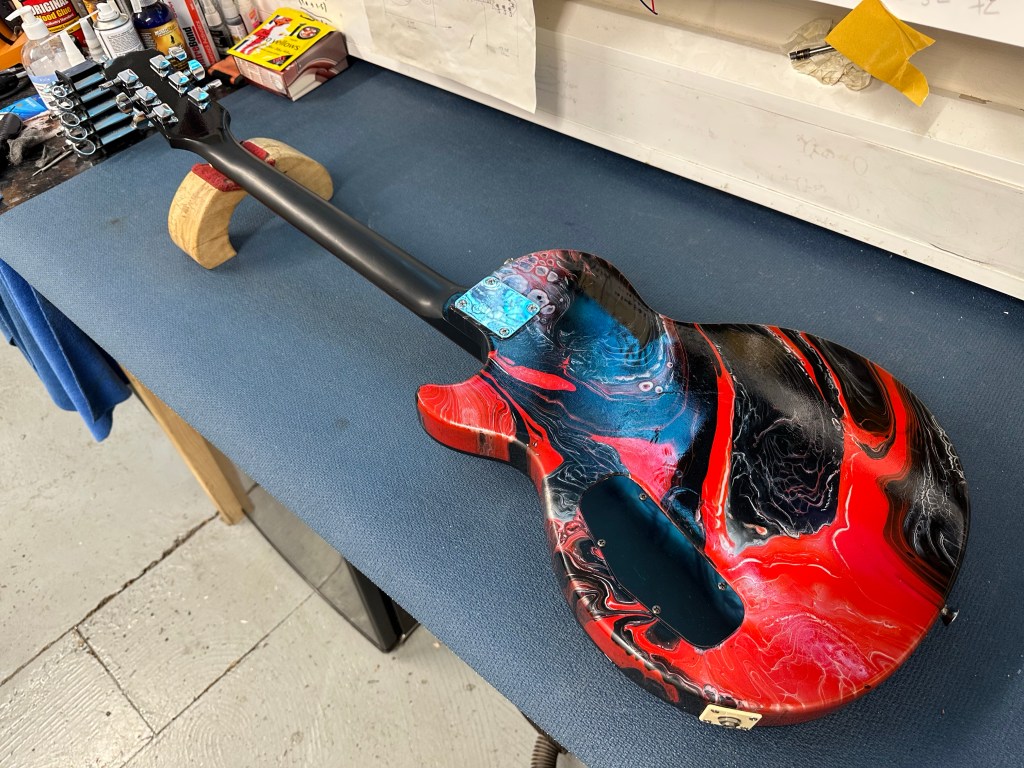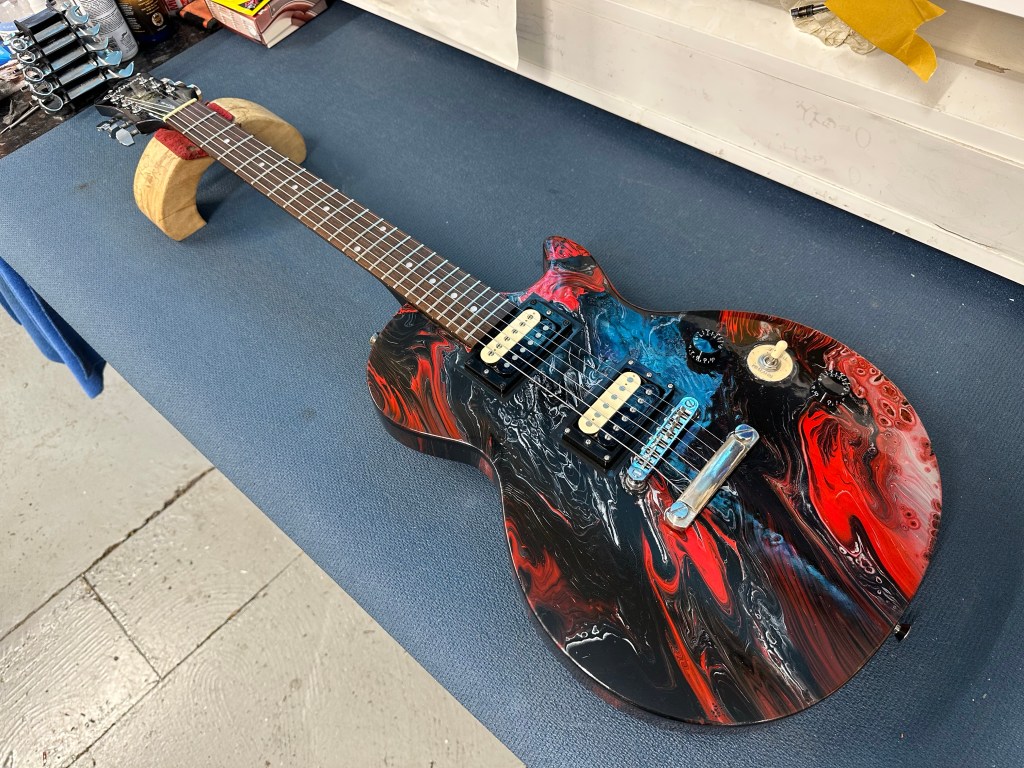 Shelly has a connection with The Spilt Milk Band, an outrageously talented group who can sing in three part harmony with a folk-indie-rock style arrangement of guitar, bass and drums. So the guitar she brought in was a surprise she was making for the guys, the prototype Acrylic House guitar, and as with all prototypes there were many problems on the way to making it exist. After a handful of weeks and consultations Shelly fine tuned a set of techniques to make an acrylic pour work on a 3D guitar surface, and protect it against the kind of wear and tear a guitar takes.