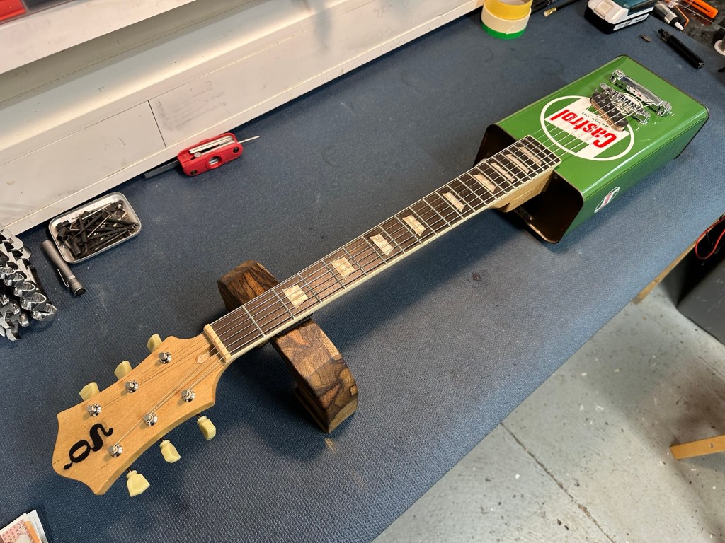 A wooden frame of ash and sapele was made to match the internal dimensions of the can, weight relief ‘added’ and hardware mountings drilled and routed. Working with sheet metal is not something I’m used to. Unlike wood, filing it into shape makes a very unpleasant sound 😆 The cap of the can is the volume control 😉👍🏻 it is tuned to open D major with a high action for blues slide jams.