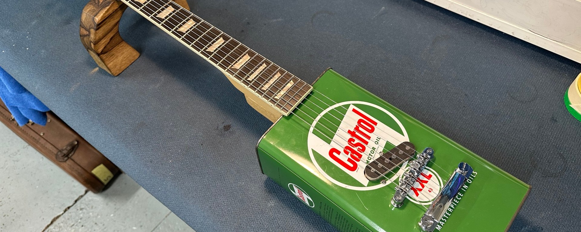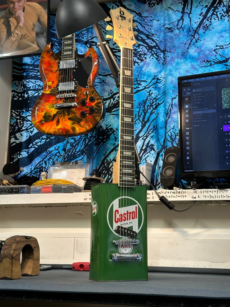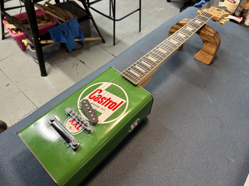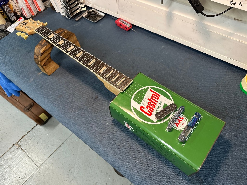 Custom build for a customer who brought in a vintage Castrol oil can and a Gibson style neck.