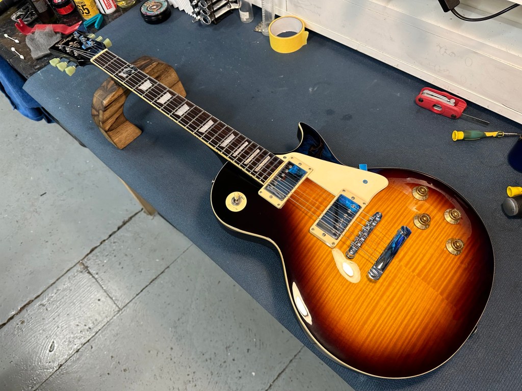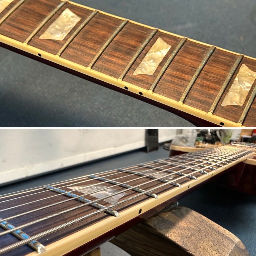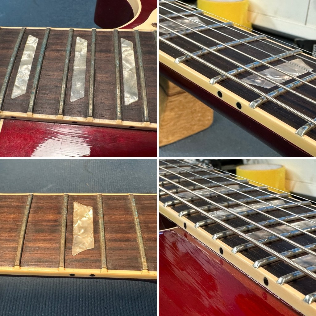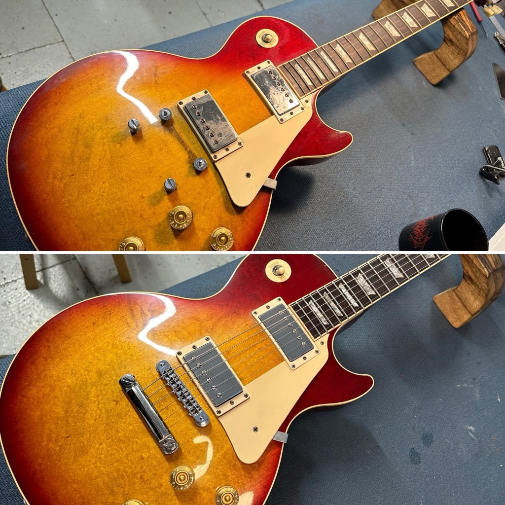 A Les Paul which suffered smoke damage in a house fire. I re-fretted with Jescar 55090 nickel wire, the same dimensions used by Gibson. Fretboard and nitro finish were restored, and the hardware was thoroughly cleaned and polished. This was a long job but great to see the final result 😁