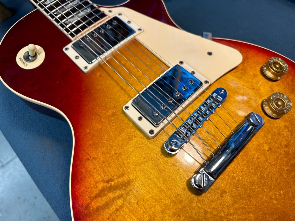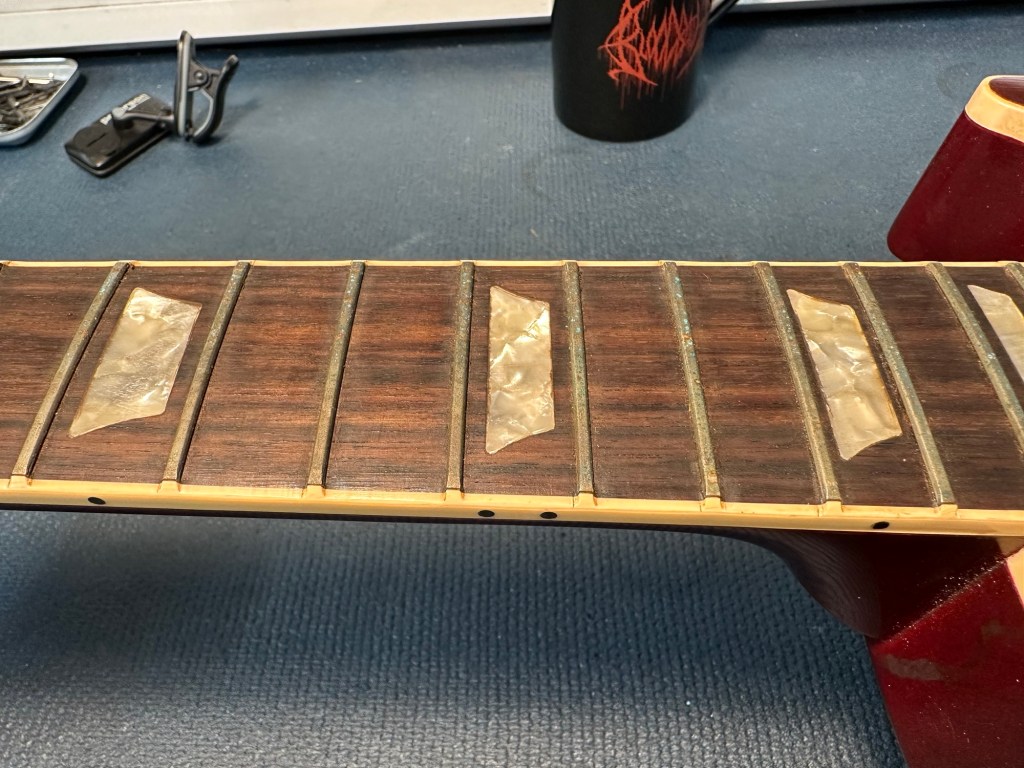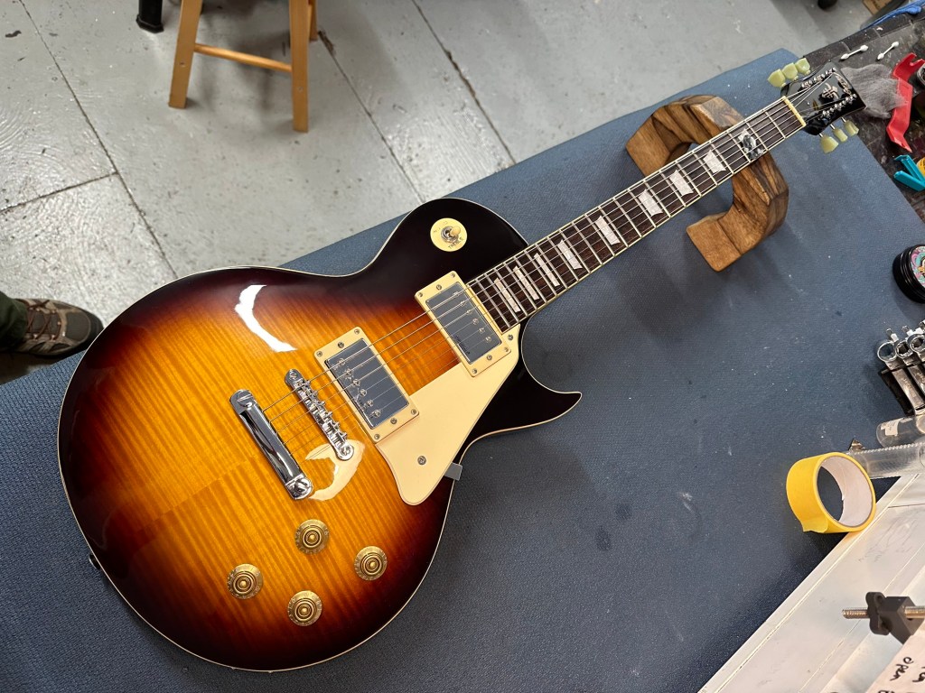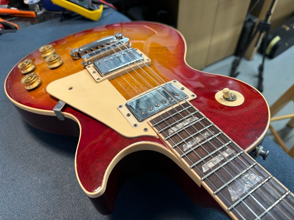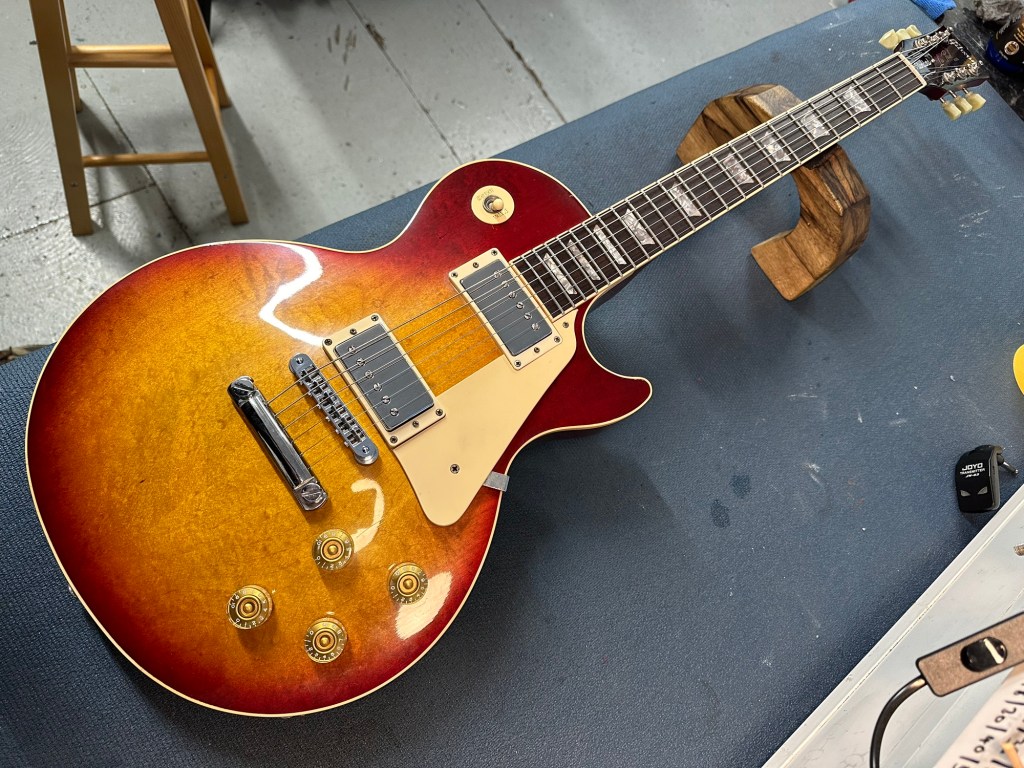 A Les Paul which suffered smoke damage in a house fire. I re-fretted with Jescar 55090 nickel wire, the same dimensions used by Gibson. Fretboard and nitro finish were restored, and the hardware was thoroughly cleaned and polished. This was a long job but great to see the final result 😁