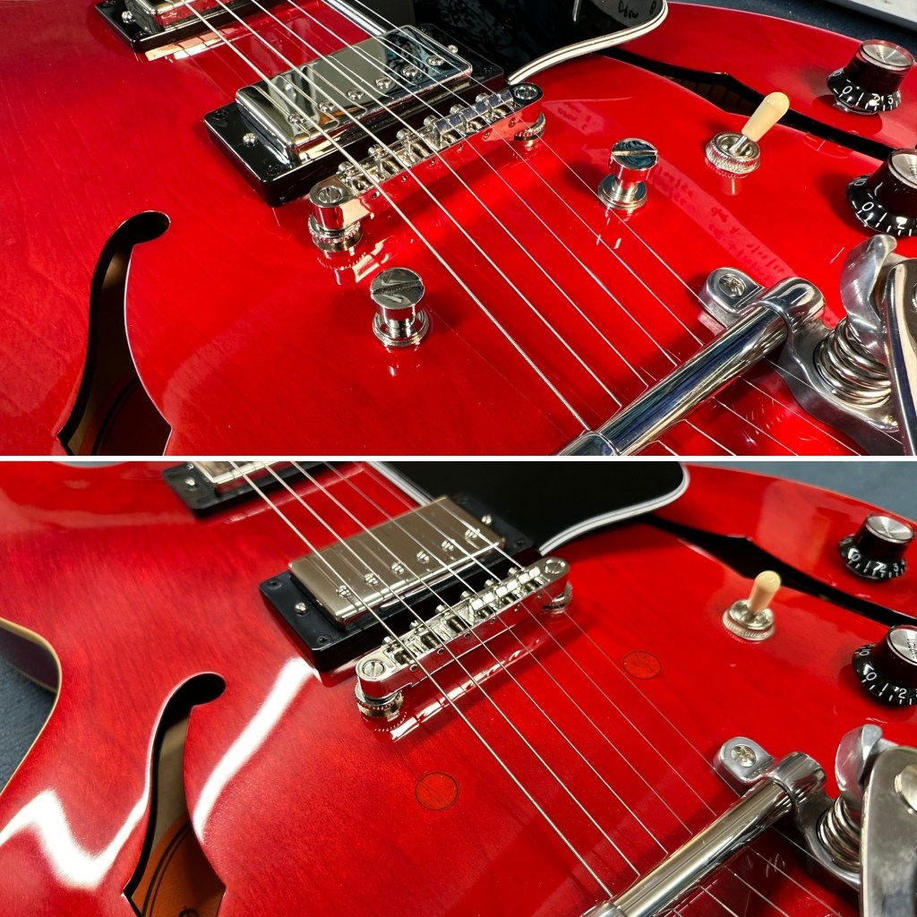 Post-Bigsby installation removal of tailpiece posts, plugging holes with sapele dowel, capped with matching grain ash laminate, colour match and lacquer patching.