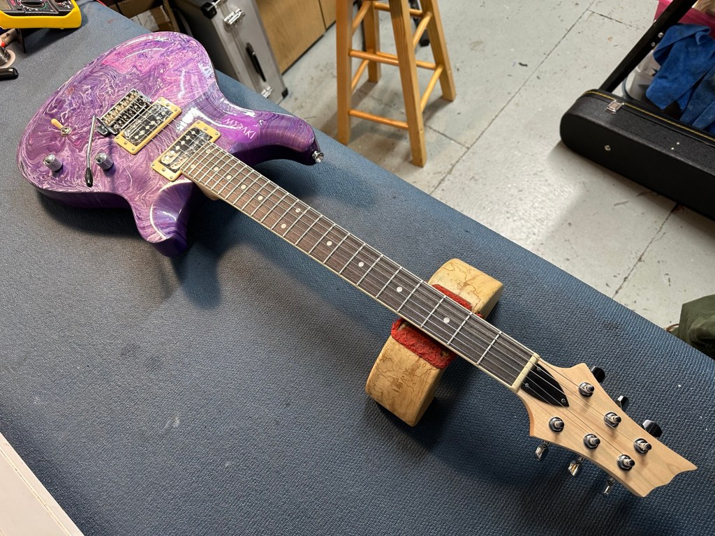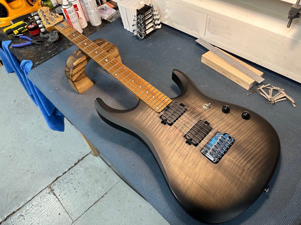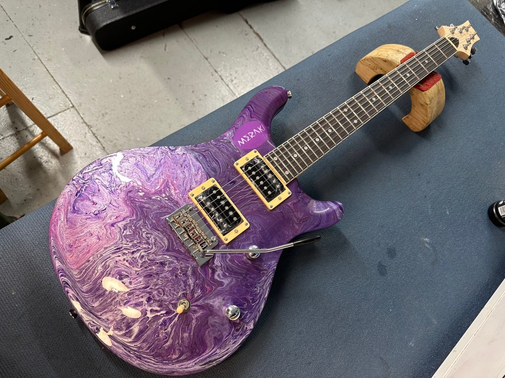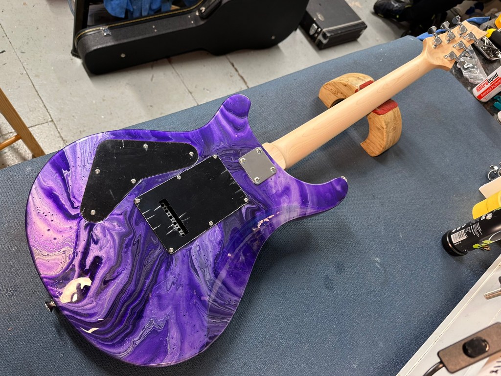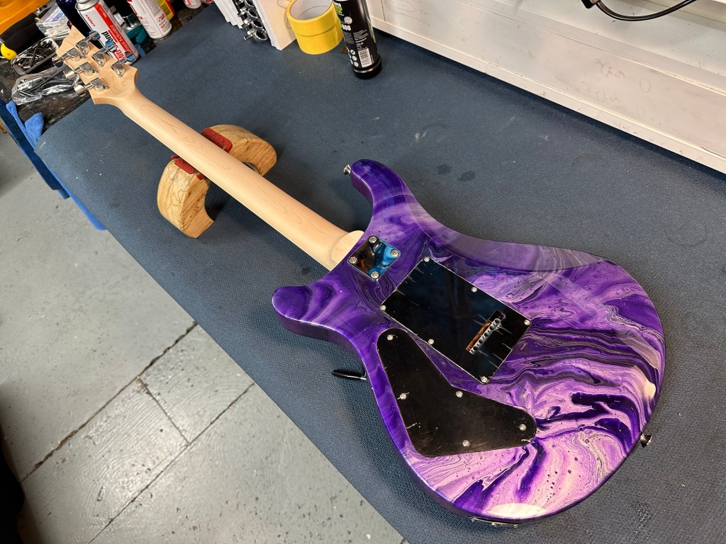 Another superb paint finish by Shelly at The Acrylic House. Assembled, fret levelled and setup in the workshop.