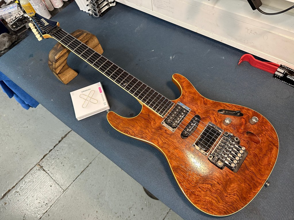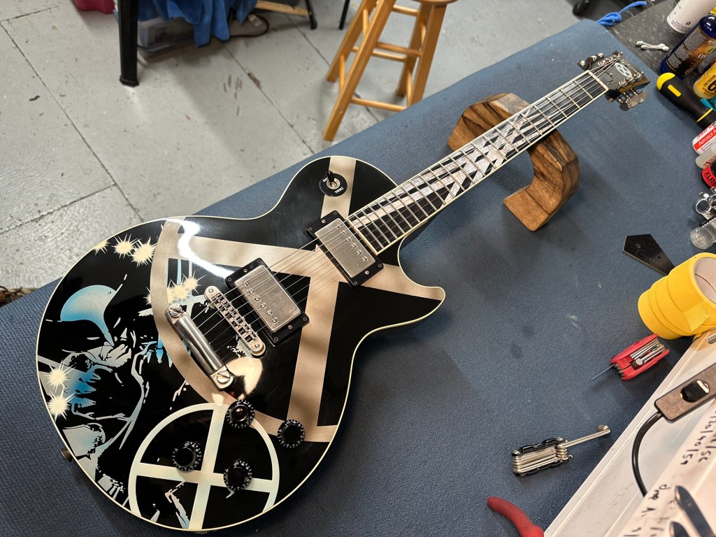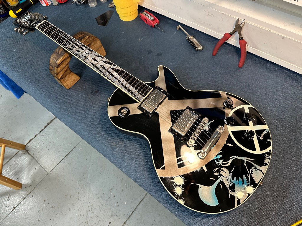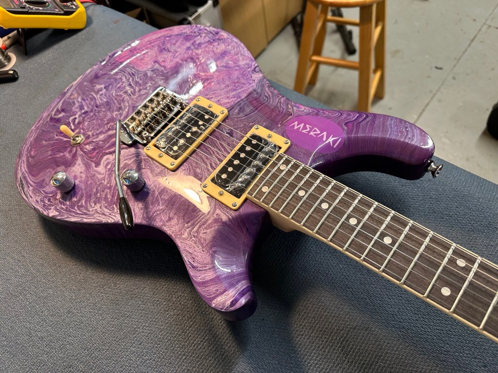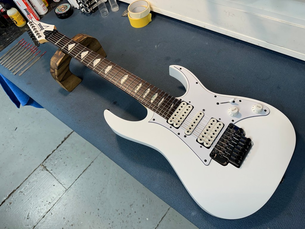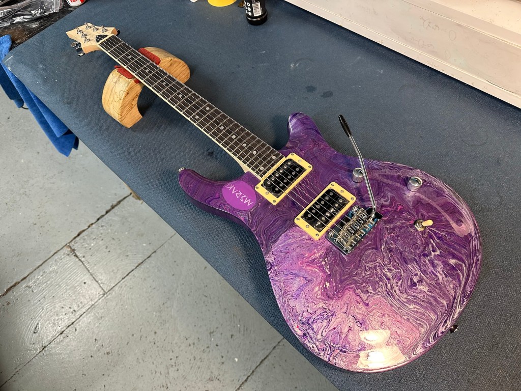 Another superb paint finish by Shelly at The Acrylic House. Assembled, fret levelled and setup in the workshop.