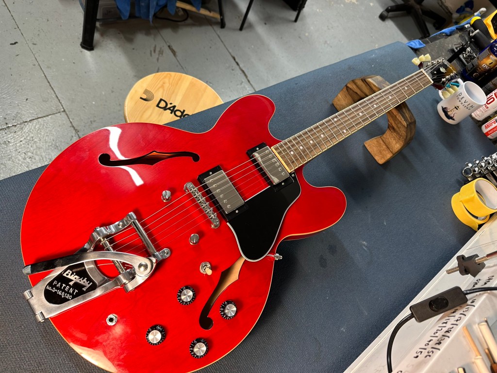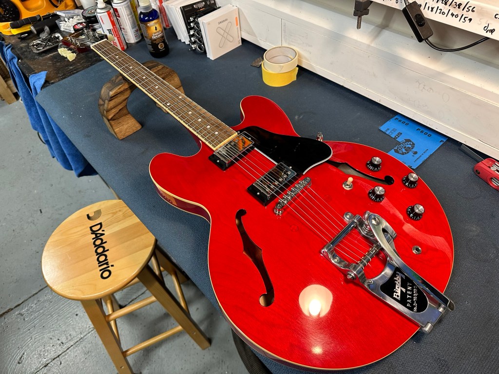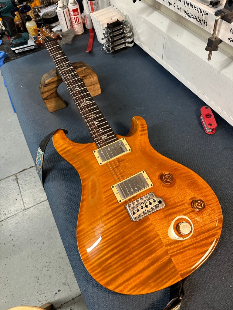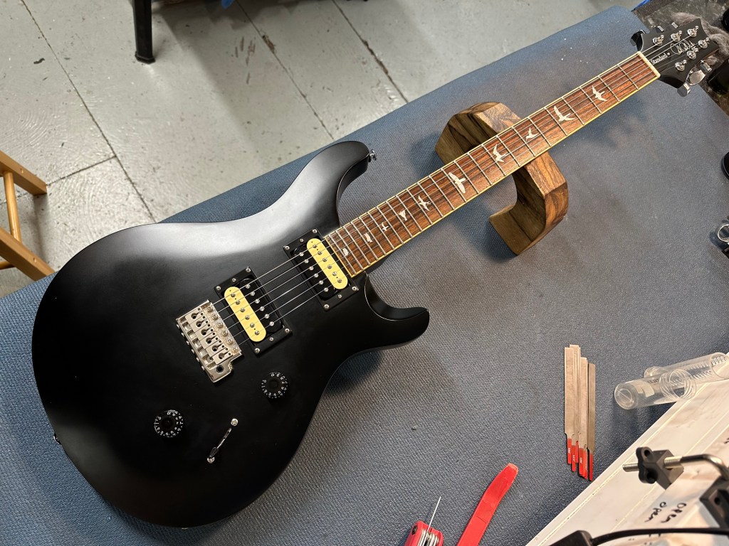 Fret level, setup, electrical repairs and polishing out a big scratch on the headstock.