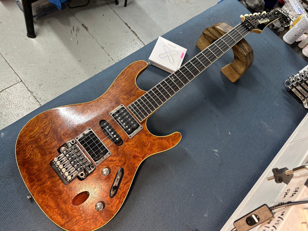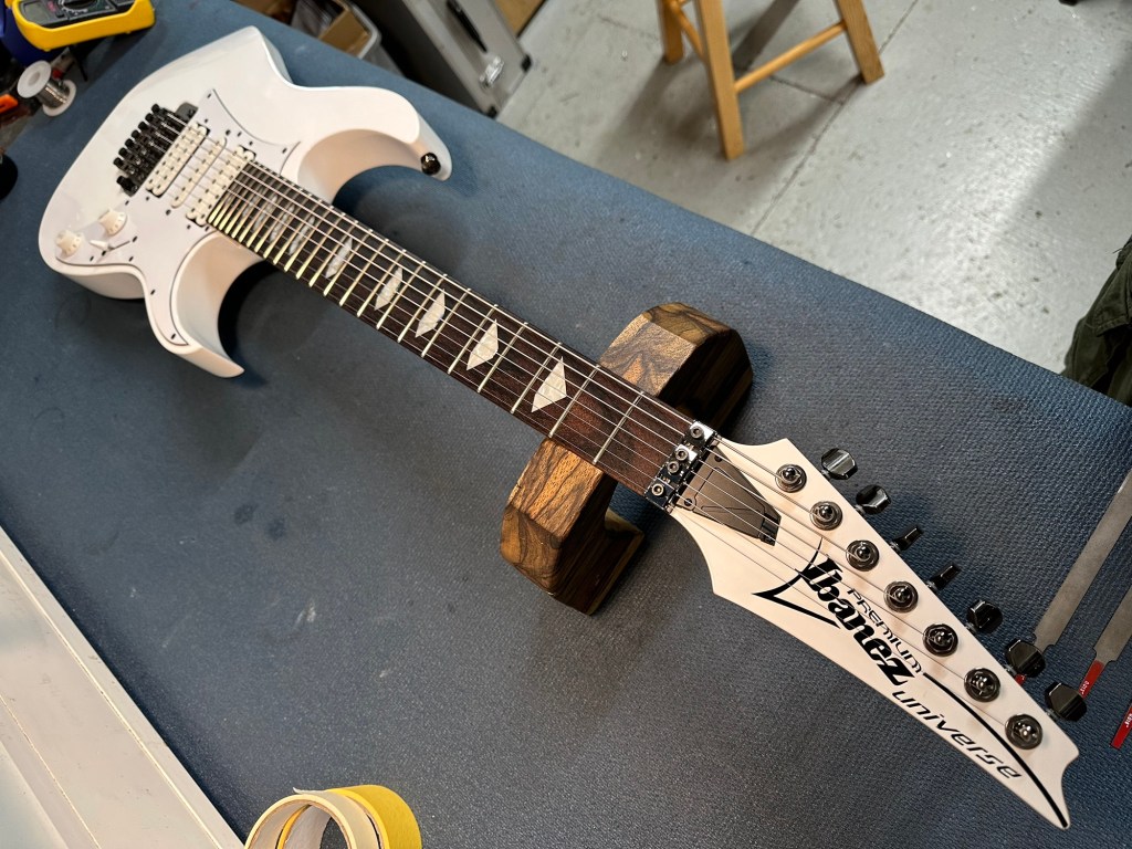 Epic. 7 string Ibanez Universe with the pyramid inlays 🤤 setup with D’Addario 10-56XS.